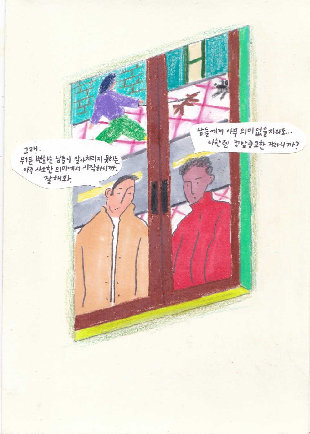 사람과 감정에 관심을 두고 대화나 장면 그 속에서 느껴지는 미세한 감정, 상상하고 가공된 이야기들, 알 수 없는 공허감 등 빠르게 지나칠 수 있는 것들에 대해 의미를 포착하여 그림으로 표현 하고 있습니다.