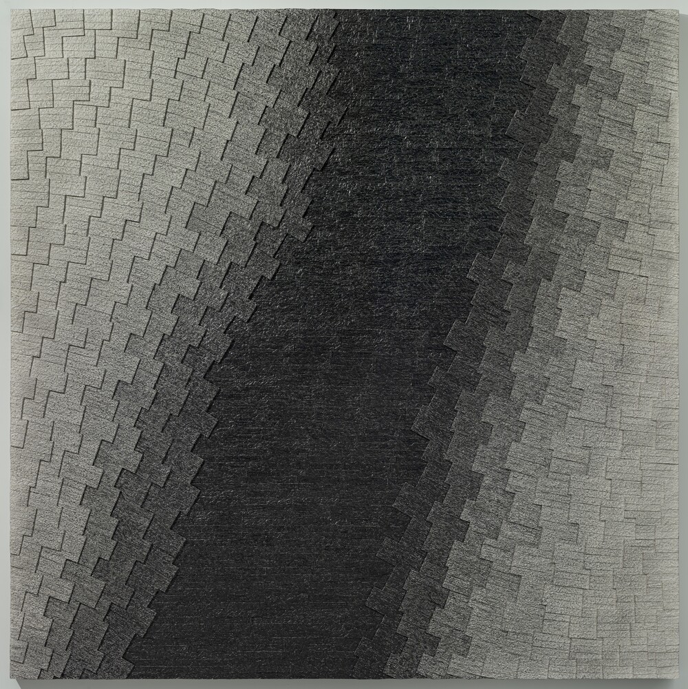 다시말해 기존에 존재해온 것을 無로 되돌리고, 무한한 가능성을 지닌채 태동하는 無는 외부적 영향의 개입으로 전혀 다른 有로서 탄생할 수 있음을 설명하는 것입니다. 작업에서 보여지는 종이 조각들은 보편적 기준에서 벗어난 또 다른 有입니다. 작가는 종이 조각들을 캔버스 화면에 채우며 그 위에 흑연을 칠하고 털어내거나 사포로 긁어내고, 때로는 색을 입히기도 합니다. 작가의 실험 의지는 다양한 형태의 이미지로 나타지만 어떠한 의미도 강요하지 않습니다. 화면을 가득 채우지만 그 끝은 역시 낯선 화면으로서의 無이기 때문입니다. 작가의 고민과 노동을 담아낸 추상적 이미지는 관람자에게 어떠한 사유를 불러일으켜 사색의 시간으로 인도하며 내면과의 소통, 즉 有에 도달하기 위해 도움을 주는 길잡이와 같은 역할을 합니다.