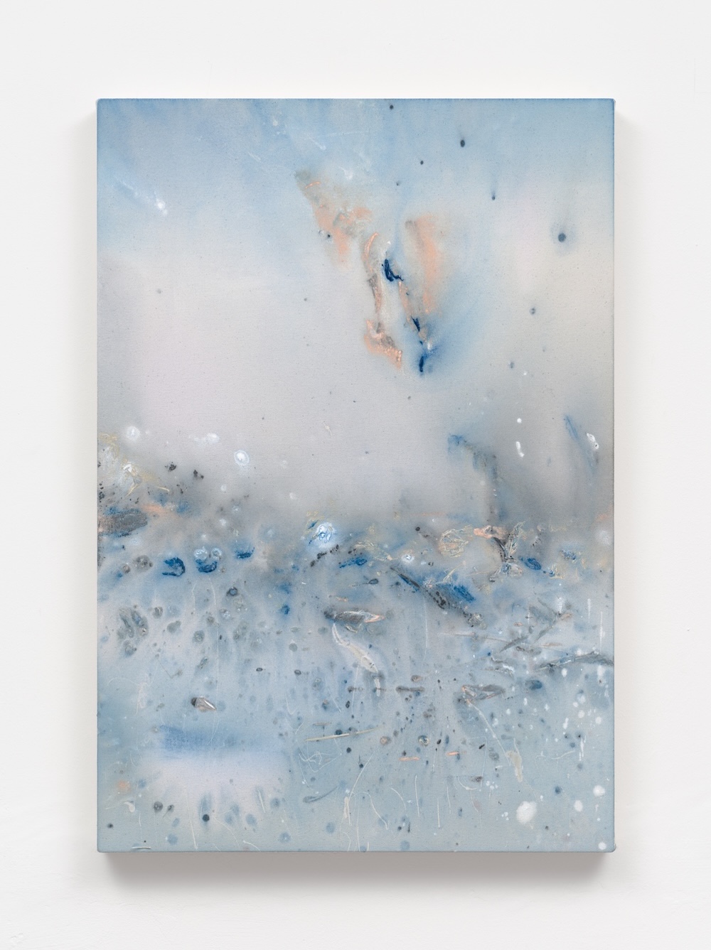The "On the waves." series expresses the location and moment where fiction and reality collide by overlapping the seasons andweather experienced on an anonymous beach and in real life. With shards of senses colliding and combining, these pieces try to aggregateeveryday life with remnants of incidental sensations. The imagined sense of movement is artistically articulated, recreated with a thin sense ofspace, and placed on a canvas based on digital photographs.