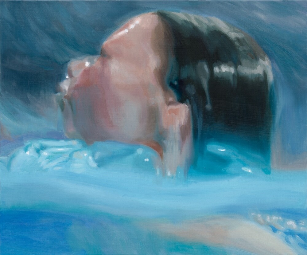 공기와 물 사이를 오가는 인체는 서로 다른 세계 경계 사이에 있다. 늘 변화하는 상황들 사이를 오가며, 묵묵히 적응하며 사는 존재들은 어쩐지 서늘한 감정을 일으킨다. 물의 푸르스름한 빛으로 물든 인체는 감당해야하는 것들을 몸에 묻히고 살아가야하는 외로운 모습의 표현이다. 하지만 파란색은 가벼워서 하늘로 날아가 버릴 것 같은 공기 같은 색이기도 하다. 그런 인체를 그리는 것은 응어리진 힘과 감정을 인식하고 물이 증발하는 것처럼 기화시켜서 흩어지게 하는 작업인 것이다. 작업은 영원히 회화 속에 머무르며 그 순간을 되새김질하는 것이다. 회화는 묽직한 물감으로 머리칼을 부드럽게 쓸어내리는 물과 빛방울을 쓸어내리면서 숨막힘을 곱씹는 것이다. 물막이 터질 것임을 알고 있으면서도 물속에 갇혀서 평온해 보이는 얼굴은 숨을 못 쉬는 불안한 상태로 때론 나를 무섭게 한다. 작업을 통해 불안을 되새김질하면서 불안을 달래고, 숨을 확인하 며 그 숨에 불안을 날려 보내보고자 한다.