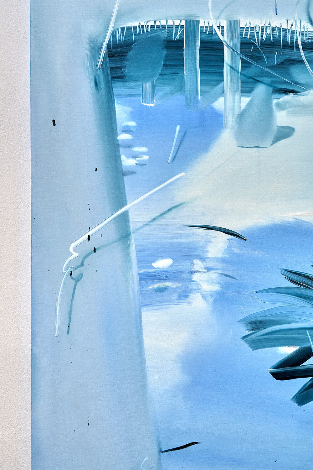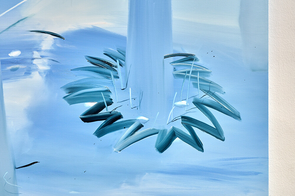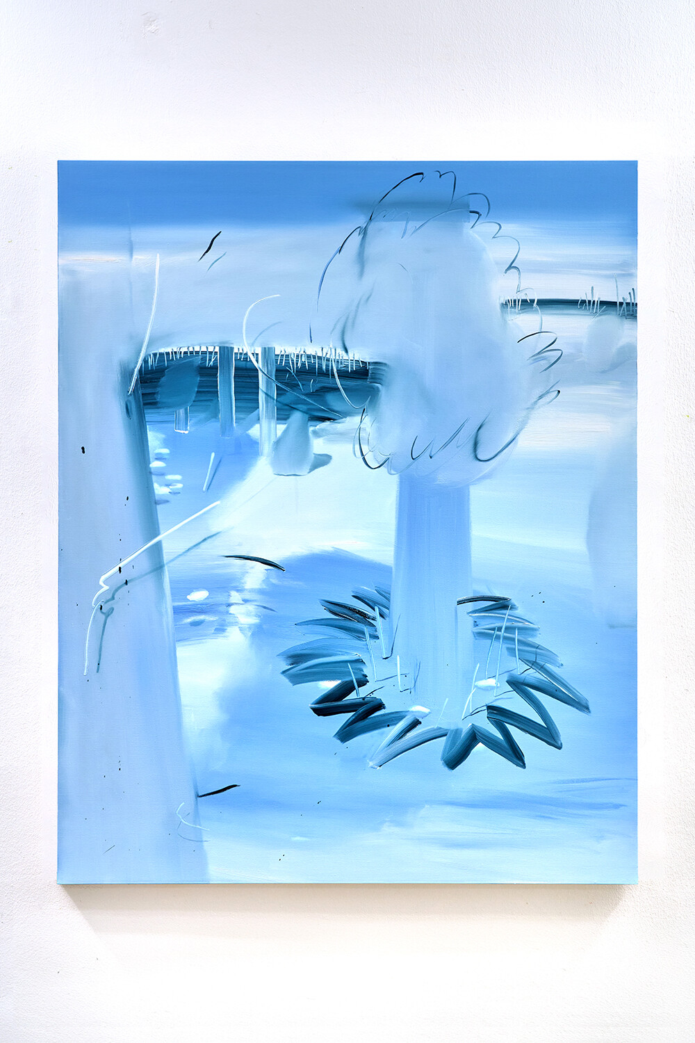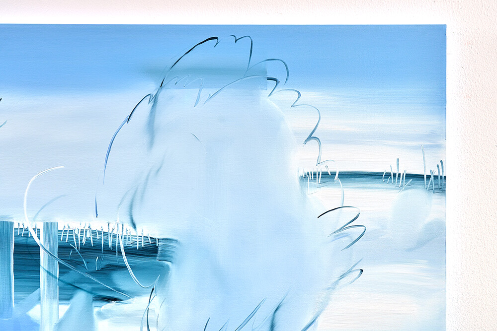 환기를 시킬 수 있도록-현재를 지내기 위한 방법, 미래를 나아가게 하는 방법은 정해져 있는 틀로 바라보는 것이 아닌 하얗고 파란 풍경 속에서 우리가 존재하며 머리 속과 마음이 광활하게 돌아다닐 수 있는 풍경들을 그려내며 예술의 힘을 불러일으키도록 한다. 그런 의미로 예술의 큰 힘은 감각이라고 생각한다. 그렇게 나는 감각적인 거품 섬으로 여러분을 초대한다. 거품 섬의 탄생은 내가 지극히 현대 일상을 가깝게 보낸 일부 중 퇴근 후의 맥주 거품의 시간을 보낸 나날들로 시작되었다. ‘거품’은 내가 사색할 수 있을 만큼의 호기심을 불러일으켰다. 액체가 공기에 맞닿아 부풀었다가 사라지는.. 또한 사라지며 액체로 자유롭게 섞이는 현상들은 마치 지나간 과거와 앞으로 어떻게 흘러갈지 모르는 미래를 걱정 없이 보여주는 것과 같았다. 거품의 현상 자체가 현재를 머무를 수 있도록 이끌어내었다. 나에게 그런 거품의 현상의 요소들 (기체에 닿아 부푸는 것, 부풀다가 사라지는 것, 사라지지만 액체 속에 스며드는 것, 또 다시 다른 거품으로 부풀리는 것)을 사용하여 거품 섬을 만들어낸다. 외부에서 만나는 사물들 사람들이 아닌 감각적인 행위들로 이루어진 풍경 속에서 나를 맞춰나가는 시간들을 그려내었다. 몸을 맡겨 풀들의 움직임을 따라가거나 넓은 색채에 물감과 오일 튀김이 곁든 지워내는 과정은 풍경 속을 사색하며 덜어내는 과정과도 같다. 채우지 않고 가볍게 가볍게 다가가는 발걸음을 하여 거품 섬의 작품 안에서 힘을 풀어 얽매였던 시각들을 풀어낸다. 몸을 풀어내고 머리를 비워내는 시간을 유화 물감의 빠르게 그려내는 속도와 풍경의 감각들을 티슈와 손끝에서 드러나게 한다. 빠르게 드러나는 속도는 유화물감의 특성인 오일로 미끄러지며 그려내는 속도와 마르지 않을때의 시간을 이용한 ’지워 그리기‘ 를 통해 작품을 그려낸다. 넓은 거품 섬의 숨들을 채우지 않고 지워 드러냄으로써 내가 붙잡아 놔야 하는 풍경이 아니라(소유) 정차 없이 떠돌아도 되는 (존재)풍경이 되어진다. 이런 거품 섬 안에서 우리들이 감각하는 것으로 나의 하루를 견고하며 별것 아닌 것들이 투명한 감각들로 특별해지는 하루를 맞이했으면 좋을 것 같다.