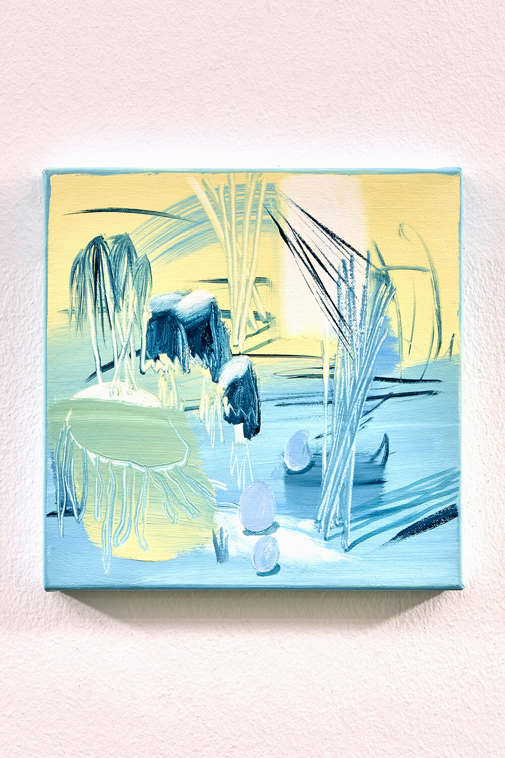 환기를 시킬 수 있도록-현재를 지내기 위한 방법, 미래를 나아가게 하는 방법은 정해져 있는 틀로 바라보는 것이 아닌 하얗고 파란 풍경 속에서 우리가 존재하며 머리 속과 마음이 광활하게 돌아다닐 수 있는 풍경들을 그려내며 예술의 힘을 불러일으키도록 한다. 그런 의미로 예술의 큰 힘은 감각이라고 생각한다. 그렇게 나는 감각적인 거품 섬으로 여러분을 초대한다. 거품 섬의 탄생은 내가 지극히 현대 일상을 가깝게 보낸 일부 중 퇴근 후의 맥주 거품의 시간을 보낸 나날들로 시작되었다. ‘거품’은 내가 사색할 수 있을 만큼의 호기심을 불러일으켰다. 액체가 공기에 맞닿아 부풀었다가 사라지는.. 또한 사라지며 액체로 자유롭게 섞이는 현상들은 마치 지나간 과거와 앞으로 어떻게 흘러갈지 모르는 미래를 걱정 없이 보여주는 것과 같았다. 거품의 현상 자체가 현재를 머무를 수 있도록 이끌어내었다. 나에게 그런 거품의 현상의 요소들 (기체에 닿아 부푸는 것, 부풀다가 사라지는 것, 사라지지만 액체 속에 스며드는 것, 또 다시 다른 거품으로 부풀리는 것)을 사용하여 거품 섬을 만들어낸다. 외부에서 만나는 사물들 사람들이 아닌 감각적인 행위들로 이루어진 풍경 속에서 나를 맞춰나가는 시간들을 그려내었다. 몸을 맡겨 풀들의 움직임을 따라가거나 넓은 색채에 물감과 오일 튀김이 곁든 지워내는 과정은 풍경 속을 사색하며 덜어내는 과정과도 같다. 채우지 않고 가볍게 가볍게 다가가는 발걸음을 하여 거품 섬의 작품 안에서 힘을 풀어 얽매였던 시각들을 풀어낸다. 몸을 풀어내고 머리를 비워내는 시간을 유화 물감의 빠르게 그려내는 속도와 풍경의 감각들을 티슈와 손끝에서 드러나게 한다. 빠르게 드러나는 속도는 유화물감의 특성인 오일로 미끄러지며 그려내는 속도와 마르지 않을때의 시간을 이용한 ’지워 그리기‘ 를 통해 작품을 그려낸다. 넓은 거품 섬의 숨들을 채우지 않고 지워 드러냄으로써 내가 붙잡아 놔야 하는 풍경이 아니라(소유) 정차 없이 떠돌아도 되는 (존재)풍경이 되어진다. 이런 거품 섬 안에서 우리들이 감각하는 것으로 나의 하루를 견고하며 별것 아닌 것들이 투명한 감각들로 특별해지는 하루를 맞이했으면 좋을 것 같다.