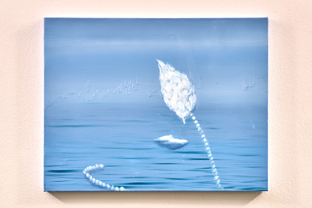 환기를 시킬 수 있도록-현재를 지내기 위한 방법, 미래를 나아가게 하는 방법은 정해져 있는 틀로 바라보는 것이 아닌 하얗고 파란 풍경 속에서 우리가 존재하며 머리 속과 마음이 광활하게 돌아다닐 수 있는 풍경들을 그려내며 예술의 힘을 불러일으키도록 한다. 그런 의미로 예술의 큰 힘은 감각이라고 생각한다. 그렇게 나는 감각적인 거품 섬으로 여러분을 초대한다. 거품 섬의 탄생은 내가 지극히 현대 일상을 가깝게 보낸 일부 중 퇴근 후의 맥주 거품의 시간을 보낸 나날들로 시작되었다. ‘거품’은 내가 사색할 수 있을 만큼의 호기심을 불러일으켰다. 액체가 공기에 맞닿아 부풀었다가 사라지는.. 또한 사라지며 액체로 자유롭게 섞이는 현상들은 마치 지나간 과거와 앞으로 어떻게 흘러갈지 모르는 미래를 걱정 없이 보여주는 것과 같았다. 거품의 현상 자체가 현재를 머무를 수 있도록 이끌어내었다. 나에게 그런 거품의 현상의 요소들 (기체에 닿아 부푸는 것, 부풀다가 사라지는 것, 사라지지만 액체 속에 스며드는 것, 또 다시 다른 거품으로 부풀리는 것)을 사용하여 거품 섬을 만들어낸다. 외부에서 만나는 사물들 사람들이 아닌 감각적인 행위들로 이루어진 풍경 속에서 나를 맞춰나가는 시간들을 그려내었다. 몸을 맡겨 풀들의 움직임을 따라가거나 넓은 색채에 물감과 오일 튀김이 곁든 지워내는 과정은 풍경 속을 사색하며 덜어내는 과정과도 같다. 채우지 않고 가볍게 가볍게 다가가는 발걸음을 하여 거품 섬의 작품 안에서 힘을 풀어 얽매였던 시각들을 풀어낸다. 몸을 풀어내고 머리를 비워내는 시간을 유화 물감의 빠르게 그려내는 속도와 풍경의 감각들을 티슈와 손끝에서 드러나게 한다. 빠르게 드러나는 속도는 유화물감의 특성인 오일로 미끄러지며 그려내는 속도와 마르지 않을때의 시간을 이용한 ’지워 그리기‘ 를 통해 작품을 그려낸다. 넓은 거품 섬의 숨들을 채우지 않고 지워 드러냄으로써 내가 붙잡아 놔야 하는 풍경이 아니라(소유) 정차 없이 떠돌아도 되는 (존재)풍경이 되어진다. 이런 거품 섬 안에서 우리들이 감각하는 것으로 나의 하루를 견고하며 별것 아닌 것들이 투명한 감각들로 특별해지는 하루를 맞이했으면 좋을 것 같다.