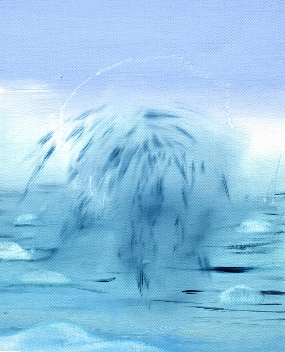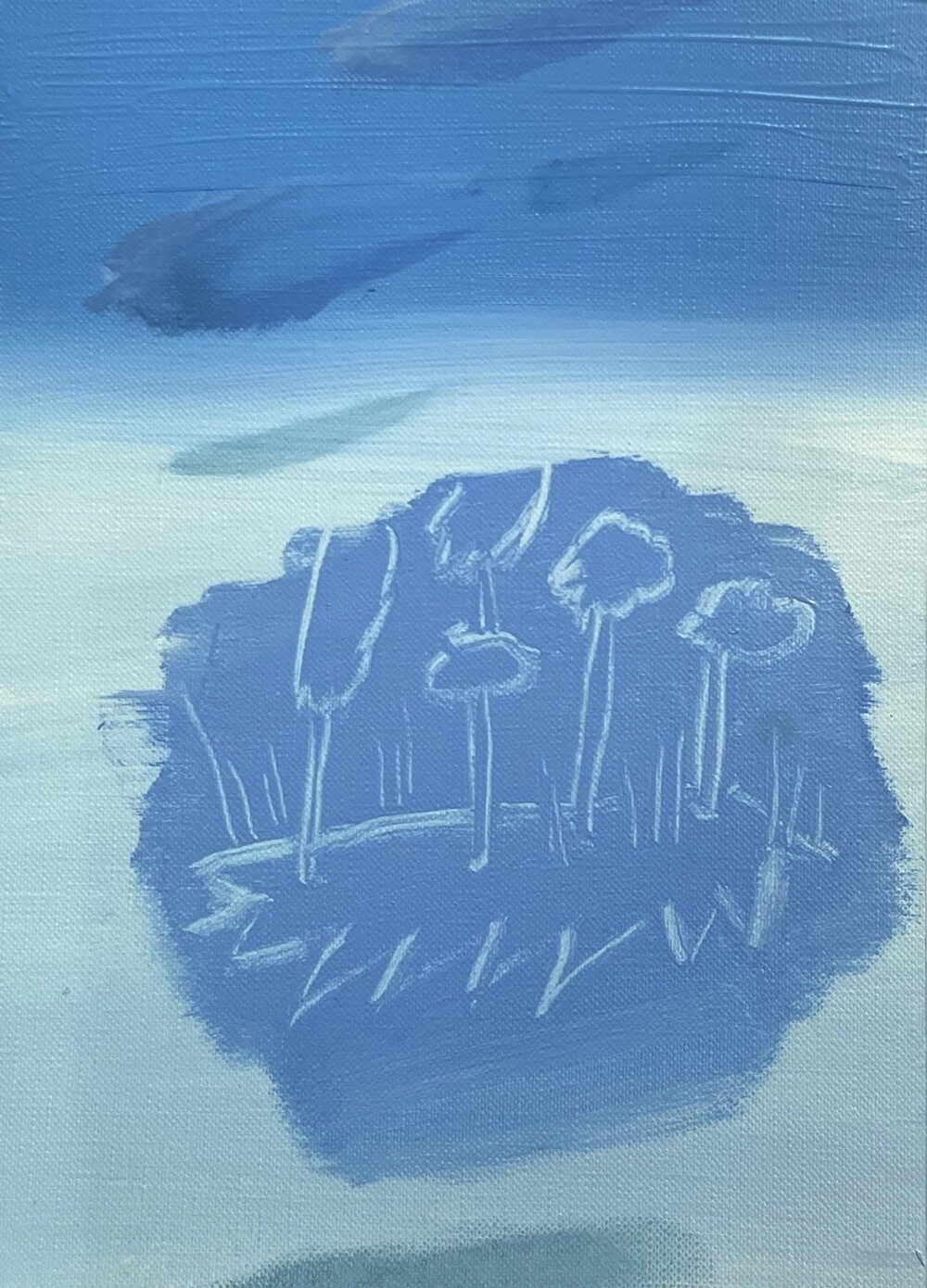 환기를 시킬 수 있도록-현재를 지내기 위한 방법, 미래를 나아가게 하는 방법은 정해져 있는 틀로 바라보는 것이 아닌 하얗고 파란 풍경 속에서 우리가 존재하며 머리 속과 마음이 광활하게 돌아다닐 수 있는 풍경들을 그려내며 예술의 힘을 불러일으키도록 한다. 그런 의미로 예술의 큰 힘은 감각이라고 생각한다. 그렇게 나는 감각적인 거품 섬으로 여러분을 초대한다. 거품 섬의 탄생은 내가 지극히 현대 일상을 가깝게 보낸 일부 중 퇴근 후의 맥주 거품의 시간을 보낸 나날들로 시작되었다. ‘거품’은 내가 사색할 수 있을 만큼의 호기심을 불러일으켰다. 액체가 공기에 맞닿아 부풀었다가 사라지는.. 또한 사라지며 액체로 자유롭게 섞이는 현상들은 마치 지나간 과거와 앞으로 어떻게 흘러갈지 모르는 미래를 걱정 없이 보여주는 것과 같았다. 거품의 현상 자체가 현재를 머무를 수 있도록 이끌어내었다. 나에게 그런 거품의 현상의 요소들 (기체에 닿아 부푸는 것, 부풀다가 사라지는 것, 사라지지만 액체 속에 스며드는 것, 또 다시 다른 거품으로 부풀리는 것)을 사용하여 거품 섬을 만들어낸다. 외부에서 만나는 사물들 사람들이 아닌 감각적인 행위들로 이루어진 풍경 속에서 나를 맞춰나가는 시간들을 그려내었다. 몸을 맡겨 풀들의 움직임을 따라가거나 넓은 색채에 물감과 오일 튀김이 곁든 지워내는 과정은 풍경 속을 사색하며 덜어내는 과정과도 같다. 채우지 않고 가볍게 가볍게 다가가는 발걸음을 하여 거품 섬의 작품 안에서 힘을 풀어 얽매였던 시각들을 풀어낸다. 몸을 풀어내고 머리를 비워내는 시간을 유화 물감의 빠르게 그려내는 속도와 풍경의 감각들을 티슈와 손끝에서 드러나게 한다. 빠르게 드러나는 속도는 유화물감의 특성인 오일로 미끄러지며 그려내는 속도와 마르지 않을때의 시간을 이용한 ’지워 그리기‘ 를 통해 작품을 그려낸다. 넓은 거품 섬의 숨들을 채우지 않고 지워 드러냄으로써 내가 붙잡아 놔야 하는 풍경이 아니라(소유) 정차 없이 떠돌아도 되는 (존재)풍경이 되어진다. 이런 거품 섬 안에서 우리들이 감각하는 것으로 나의 하루를 견고하며 별것 아닌 것들이 투명한 감각들로 특별해지는 하루를 맞이했으면 좋을 것 같다.