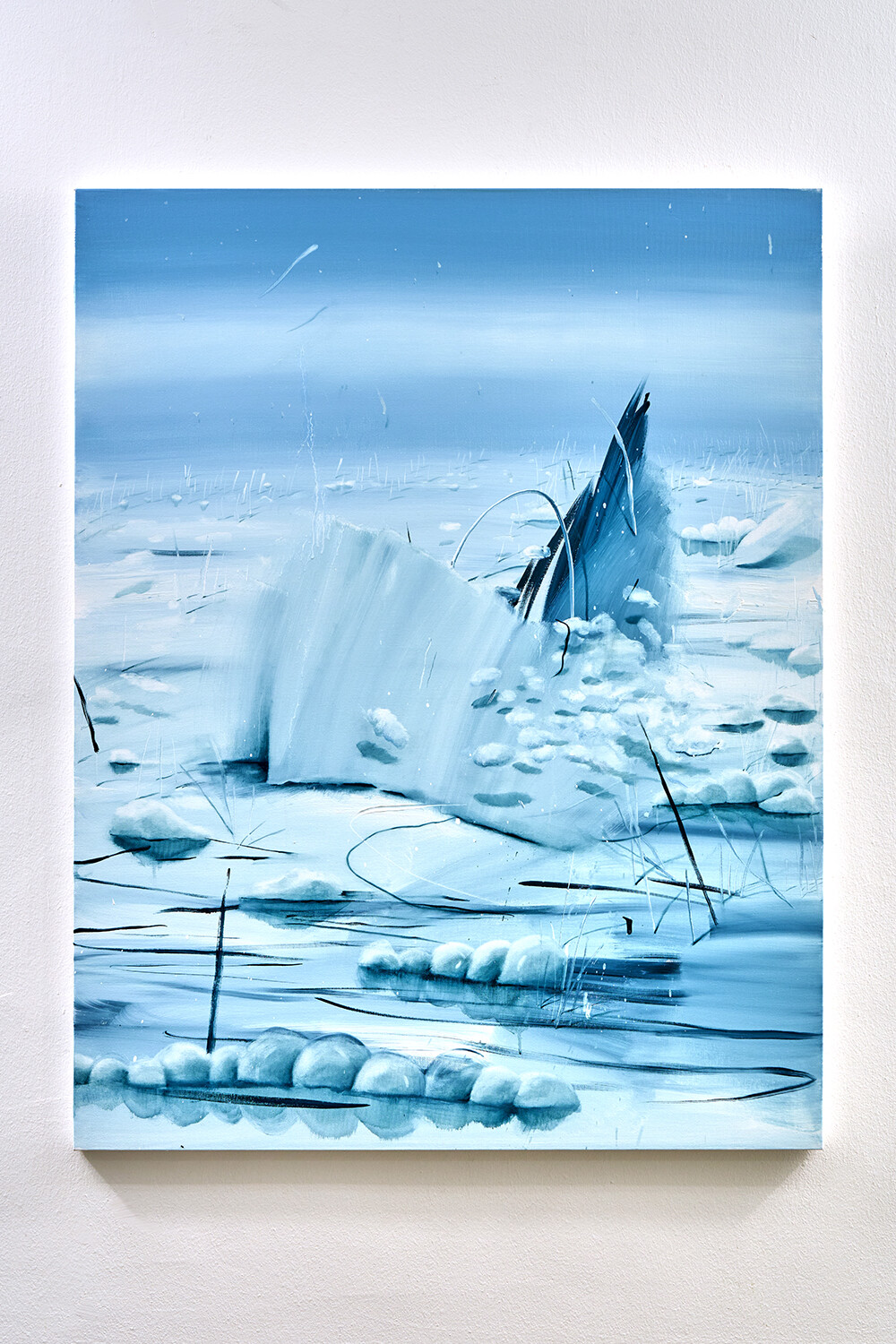 환기를 시킬 수 있도록-현재를 지내기 위한 방법, 미래를 나아가게 하는 방법은 정해져 있는 틀로 바라보는 것이 아닌 하얗고 파란 풍경 속에서 우리가 존재하며 머리 속과 마음이 광활하게 돌아다닐 수 있는 풍경들을 그려내며 예술의 힘을 불러일으키도록 한다. 그런 의미로 예술의 큰 힘은 감각이라고 생각한다. 그렇게 나는 감각적인 거품 섬으로 여러분을 초대한다. 거품 섬의 탄생은 내가 지극히 현대 일상을 가깝게 보낸 일부 중 퇴근 후의 맥주 거품의 시간을 보낸 나날들로 시작되었다. ‘거품’은 내가 사색할 수 있을 만큼의 호기심을 불러일으켰다. 액체가 공기에 맞닿아 부풀었다가 사라지는.. 또한 사라지며 액체로 자유롭게 섞이는 현상들은 마치 지나간 과거와 앞으로 어떻게 흘러갈지 모르는 미래를 걱정 없이 보여주는 것과 같았다. 거품의 현상 자체가 현재를 머무를 수 있도록 이끌어내었다. 나에게 그런 거품의 현상의 요소들 (기체에 닿아 부푸는 것, 부풀다가 사라지는 것, 사라지지만 액체 속에 스며드는 것, 또 다시 다른 거품으로 부풀리는 것)을 사용하여 거품 섬을 만들어낸다. 외부에서 만나는 사물들 사람들이 아닌 감각적인 행위들로 이루어진 풍경 속에서 나를 맞춰나가는 시간들을 그려내었다. 몸을 맡겨 풀들의 움직임을 따라가거나 넓은 색채에 물감과 오일 튀김이 곁든 지워내는 과정은 풍경 속을 사색하며 덜어내는 과정과도 같다. 채우지 않고 가볍게 가볍게 다가가는 발걸음을 하여 거품 섬의 작품 안에서 힘을 풀어 얽매였던 시각들을 풀어낸다. 몸을 풀어내고 머리를 비워내는 시간을 유화 물감의 빠르게 그려내는 속도와 풍경의 감각들을 티슈와 손끝에서 드러나게 한다. 빠르게 드러나는 속도는 유화물감의 특성인 오일로 미끄러지며 그려내는 속도와 마르지 않을때의 시간을 이용한 ’지워 그리기‘ 를 통해 작품을 그려낸다. 넓은 거품 섬의 숨들을 채우지 않고 지워 드러냄으로써 내가 붙잡아 놔야 하는 풍경이 아니라(소유) 정차 없이 떠돌아도 되는 (존재)풍경이 되어진다. 이런 거품 섬 안에서 우리들이 감각하는 것으로 나의 하루를 견고하며 별것 아닌 것들이 투명한 감각들로 특별해지는 하루를 맞이했으면 좋을 것 같다.