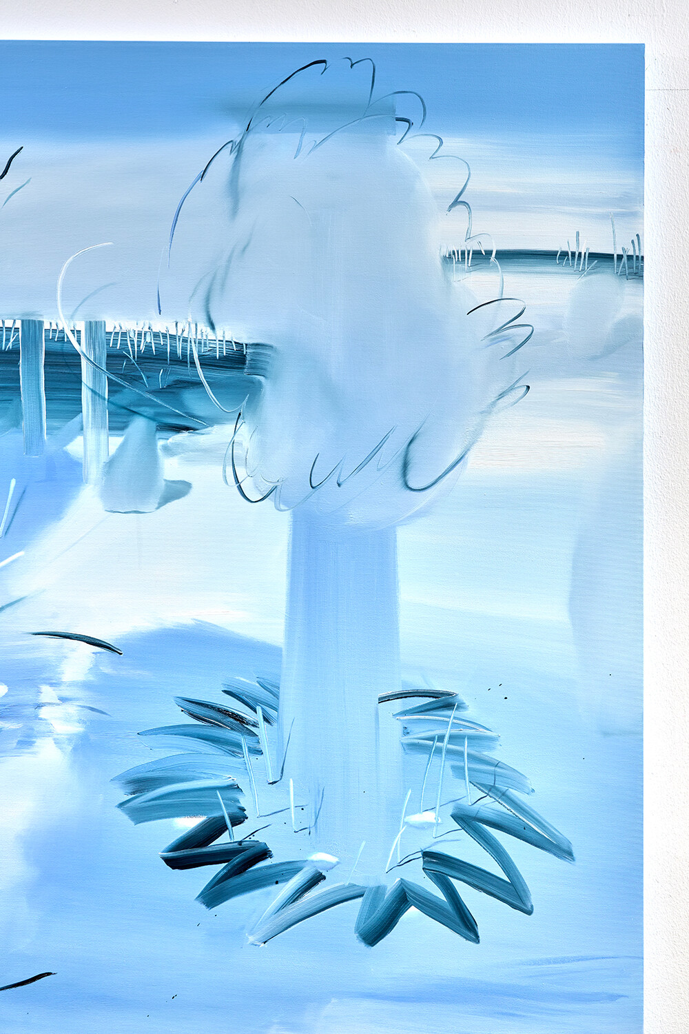 환기를 시킬 수 있도록-현재를 지내기 위한 방법, 미래를 나아가게 하는 방법은 정해져 있는 틀로 바라보는 것이 아닌 하얗고 파란 풍경 속에서 우리가 존재하며 머리 속과 마음이 광활하게 돌아다닐 수 있는 풍경들을 그려내며 예술의 힘을 불러일으키도록 한다. 그런 의미로 예술의 큰 힘은 감각이라고 생각한다. 그렇게 나는 감각적인 거품 섬으로 여러분을 초대한다. 거품 섬의 탄생은 내가 지극히 현대 일상을 가깝게 보낸 일부 중 퇴근 후의 맥주 거품의 시간을 보낸 나날들로 시작되었다. ‘거품’은 내가 사색할 수 있을 만큼의 호기심을 불러일으켰다. 액체가 공기에 맞닿아 부풀었다가 사라지는.. 또한 사라지며 액체로 자유롭게 섞이는 현상들은 마치 지나간 과거와 앞으로 어떻게 흘러갈지 모르는 미래를 걱정 없이 보여주는 것과 같았다. 거품의 현상 자체가 현재를 머무를 수 있도록 이끌어내었다. 나에게 그런 거품의 현상의 요소들 (기체에 닿아 부푸는 것, 부풀다가 사라지는 것, 사라지지만 액체 속에 스며드는 것, 또 다시 다른 거품으로 부풀리는 것)을 사용하여 거품 섬을 만들어낸다. 외부에서 만나는 사물들 사람들이 아닌 감각적인 행위들로 이루어진 풍경 속에서 나를 맞춰나가는 시간들을 그려내었다. 몸을 맡겨 풀들의 움직임을 따라가거나 넓은 색채에 물감과 오일 튀김이 곁든 지워내는 과정은 풍경 속을 사색하며 덜어내는 과정과도 같다. 채우지 않고 가볍게 가볍게 다가가는 발걸음을 하여 거품 섬의 작품 안에서 힘을 풀어 얽매였던 시각들을 풀어낸다. 몸을 풀어내고 머리를 비워내는 시간을 유화 물감의 빠르게 그려내는 속도와 풍경의 감각들을 티슈와 손끝에서 드러나게 한다. 빠르게 드러나는 속도는 유화물감의 특성인 오일로 미끄러지며 그려내는 속도와 마르지 않을때의 시간을 이용한 ’지워 그리기‘ 를 통해 작품을 그려낸다. 넓은 거품 섬의 숨들을 채우지 않고 지워 드러냄으로써 내가 붙잡아 놔야 하는 풍경이 아니라(소유) 정차 없이 떠돌아도 되는 (존재)풍경이 되어진다. 이런 거품 섬 안에서 우리들이 감각하는 것으로 나의 하루를 견고하며 별것 아닌 것들이 투명한 감각들로 특별해지는 하루를 맞이했으면 좋을 것 같다.