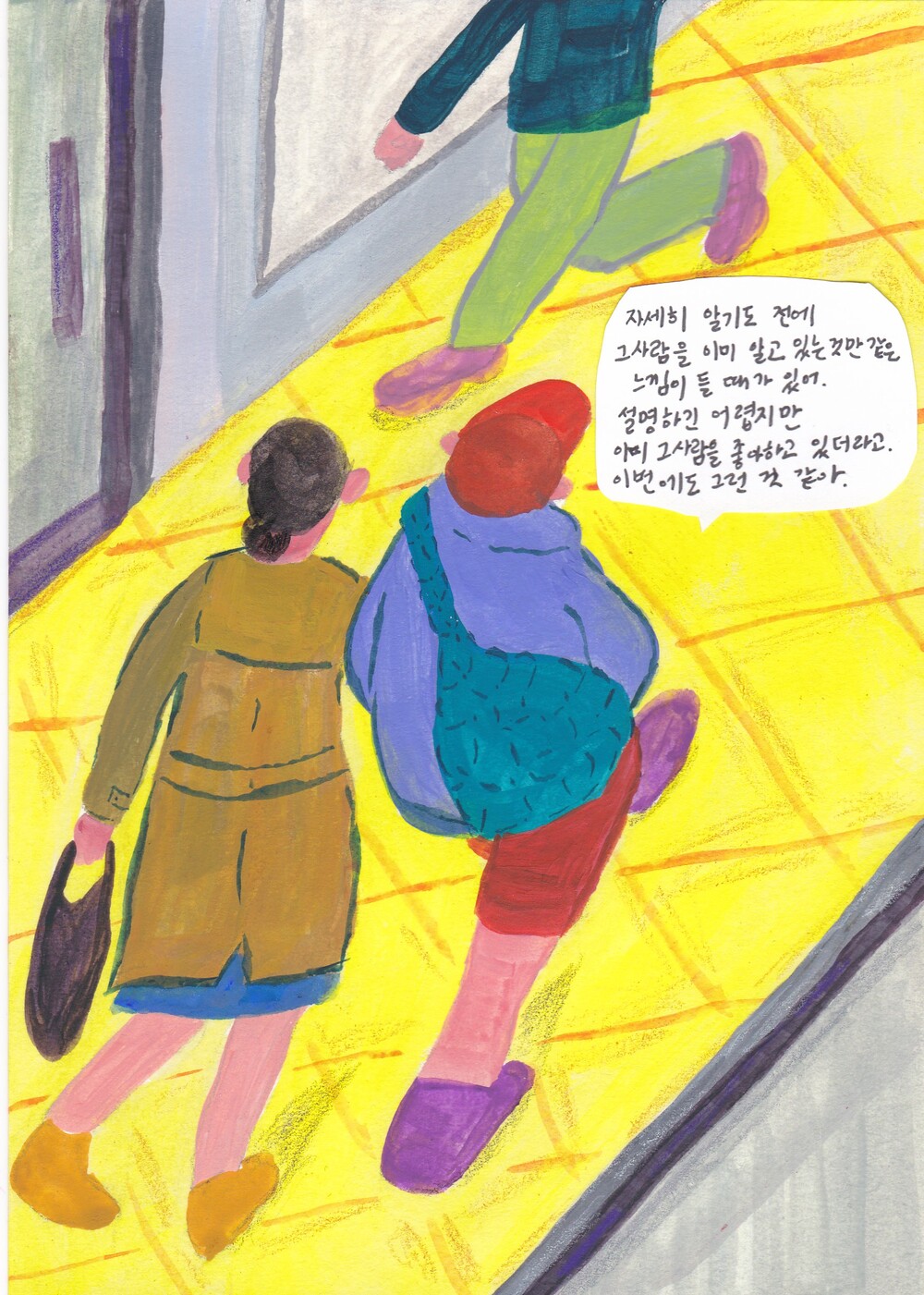 사람과 감정에 관심을 두고 대화나 장면 그 속에서 느껴지는 미세한 감정, 상상하고 가공된 이야기들, 알 수 없는 공허감 등 빠르게 지나칠 수 있는 것들에 대해 의미를 포착하여 그림으로 표현 하고 있습니다.