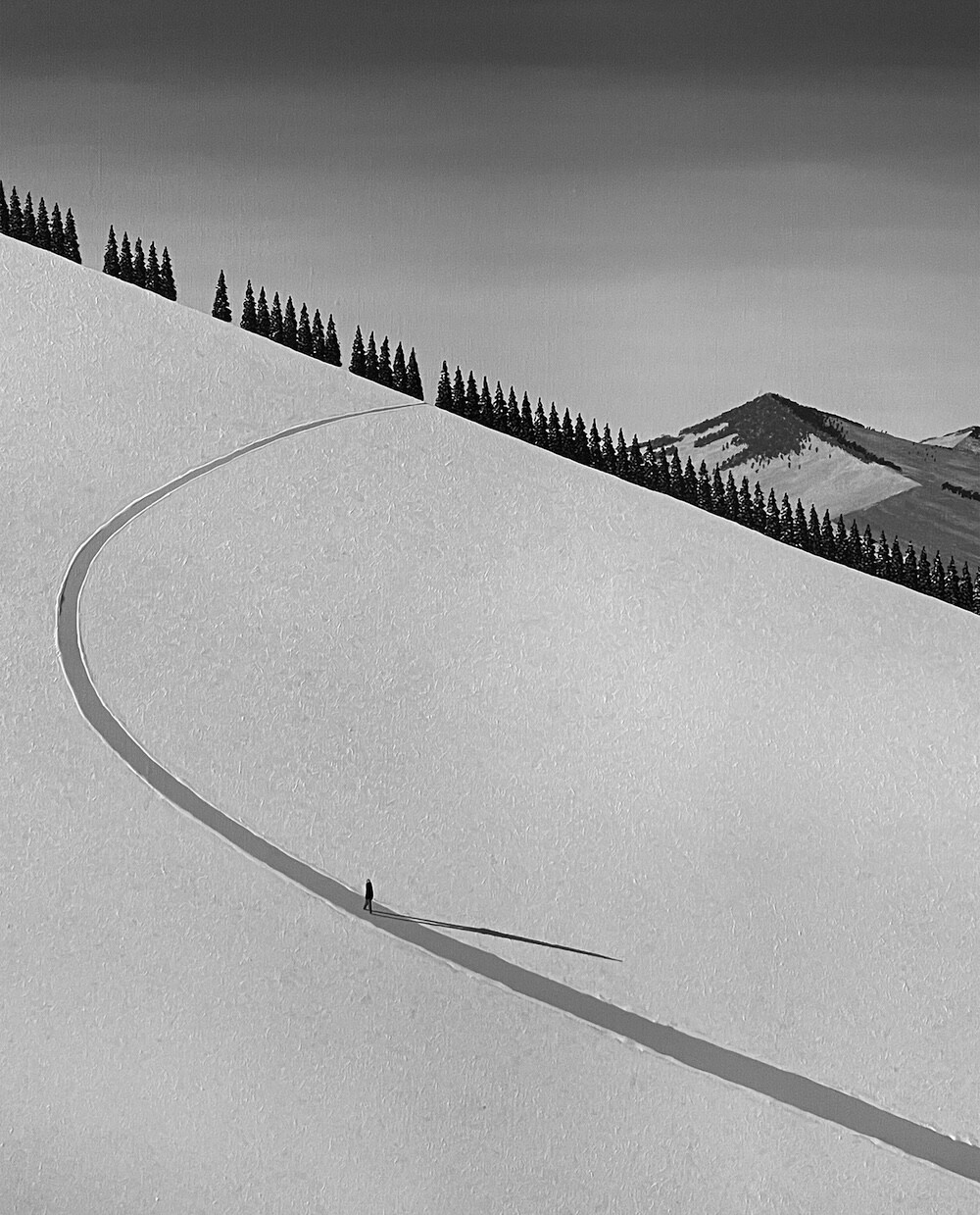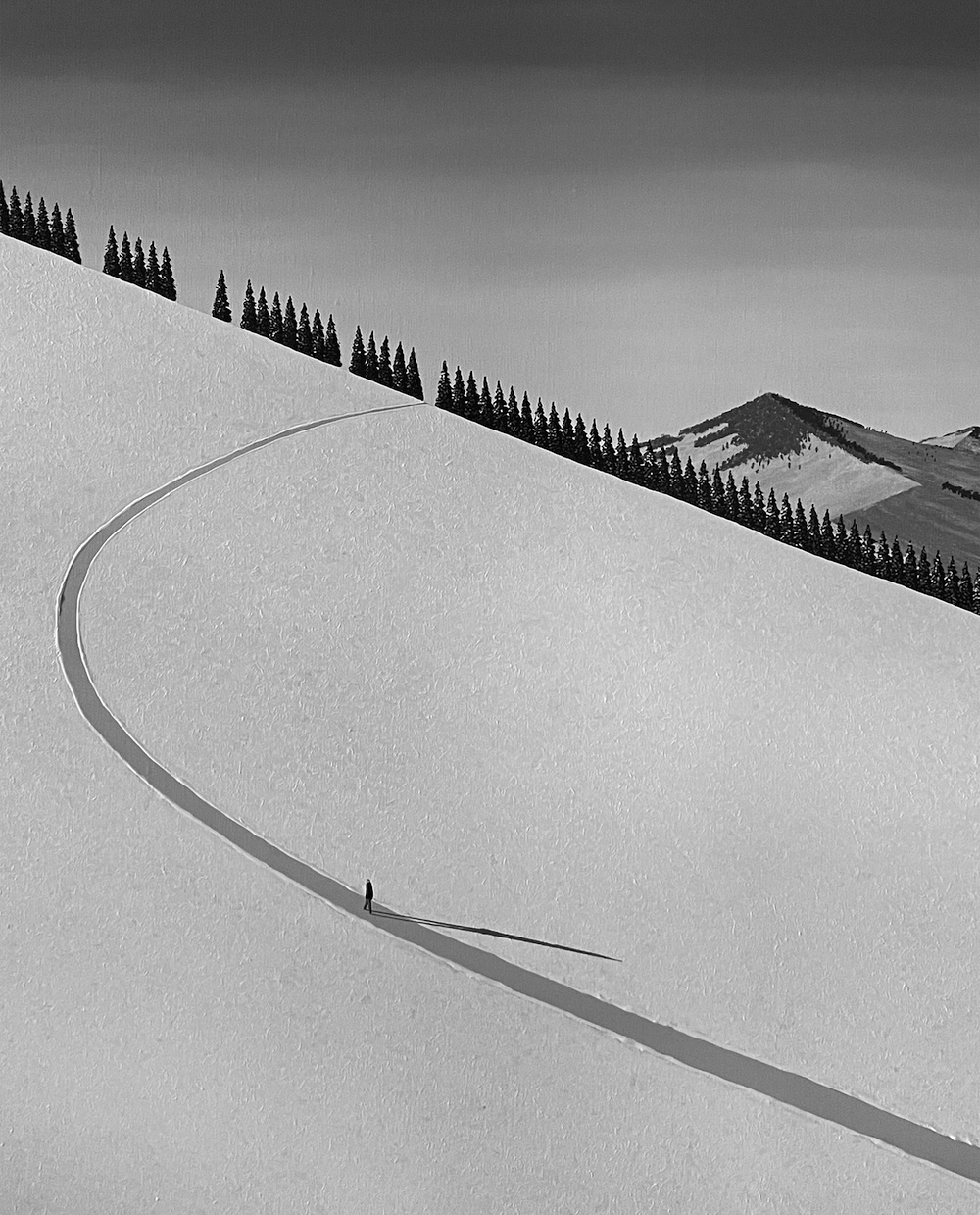 ‘어떻게 살 것인가’, ‘나는 누구인가’에 대한 사유는 살아가면서 갖춰야 할 중요한 삶의 자세 중 하나이다. 그 사유는 필히 내면의 탐구를 통해서 이루어지며 그 내면으로 들어가기 위해서는 자발적 침묵과 고독의 시간이 필요한데 여기서 말하는 자발적 고독은 홀로 있는 상황만을 이야기하는 것이 아닌 지나간 마음의 짐을 아직도 짊어지고 있지 않는 것, 어제의 것을 오늘로 갖고 오지 않는 것과 같이 고요한 마음의 상태를 뜻하기도 한다. 하지만 현대의 사람들은 그런 고요한 마음을 일상 속에서 실천하기 어려운 것이 사실이다. 따라서 작가는 그림 속에서 느낄 수 있는 고요함을 통해 사람들에게 마음의 짐을 잠시 내려놓고 스스로 내면의 여정을 떠날 수 있는 발판을 마련해 주고자 한다. 겨울의 자연에서 느낄 수 있는 완전한 혼자만의 고요함, 광활한 자연을 향해 걸어가는 한 사람의 뒷모습에서 느낄 수 있는 강인한 묵묵함은 자신을 알아가기 위한 사람들의 여정 속 고독의 동지가 되어준다.
