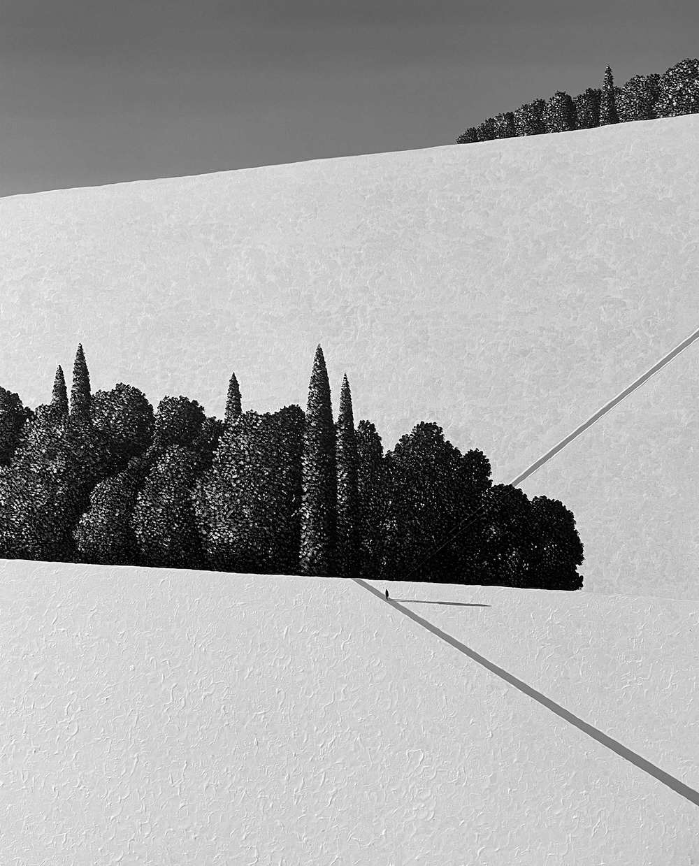 ‘어떻게 살 것인가’, ‘나는 누구인가’에 대한 사유는 살아가면서 갖춰야 할 중요한 삶의 자세 중 하나이다. 그 사유는 필히 내면의 탐구를 통해서 이루어지며 그 내면으로 들어가기 위해서는 자발적 침묵과 고독의 시간이 필요한데 여기서 말하는 자발적 고독은 홀로 있는 상황만을 이야기하는 것이 아닌 지나간 마음의 짐을 아직도 짊어지고 있지 않는 것, 어제의 것을 오늘로 갖고 오지 않는 것과 같이 고요한 마음의 상태를 뜻하기도 한다. 하지만 현대의 사람들은 그런 고요한 마음을 일상 속에서 실천하기 어려운 것이 사실이다. 따라서 작가는 그림 속에서 느낄 수 있는 고요함을 통해 사람들에게 마음의 짐을 잠시 내려놓고 스스로 내면의 여정을 떠날 수 있는 발판을 마련해 주고자 한다. 겨울의 자연에서 느낄 수 있는 완전한 혼자만의 고요함, 광활한 자연을 향해 걸어가는 한 사람의 뒷모습에서 느낄 수 있는 강인한 묵묵함은 자신을 알아가기 위한 사람들의 여정 속 고독의 동지가 되어준다.