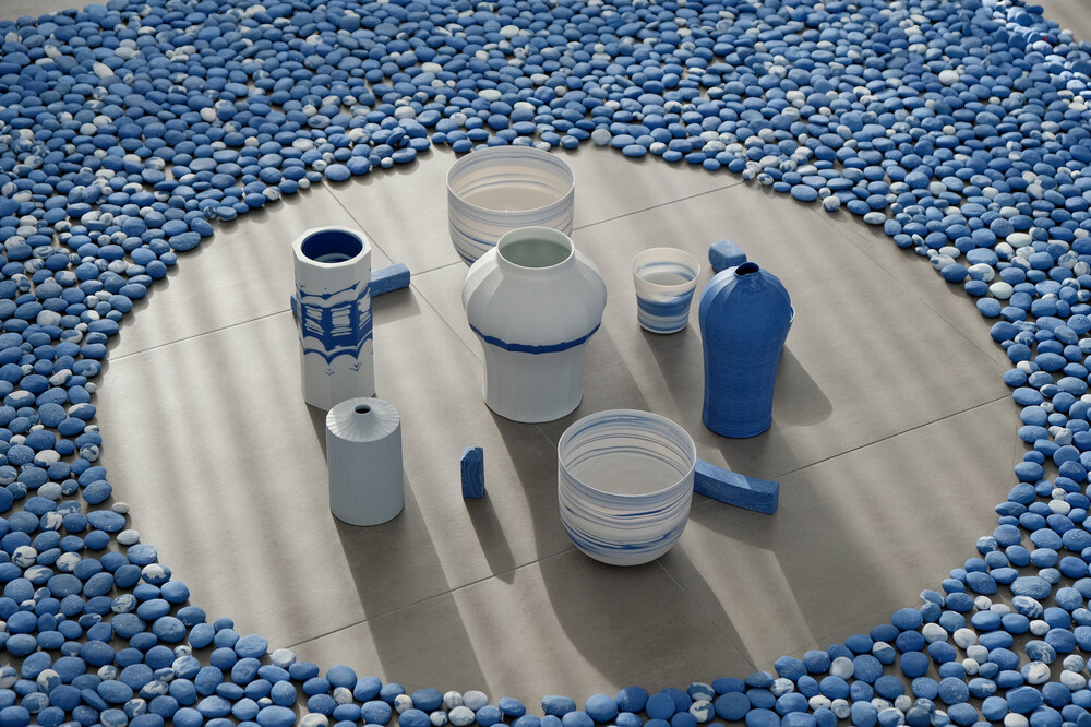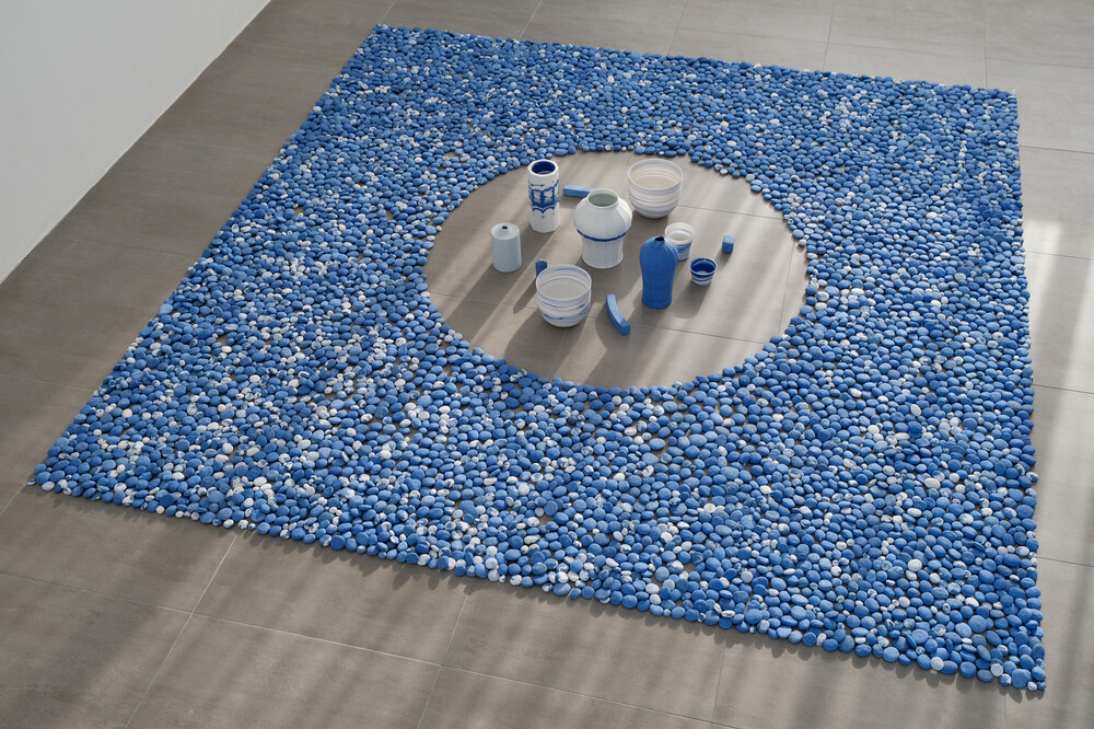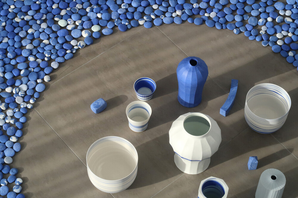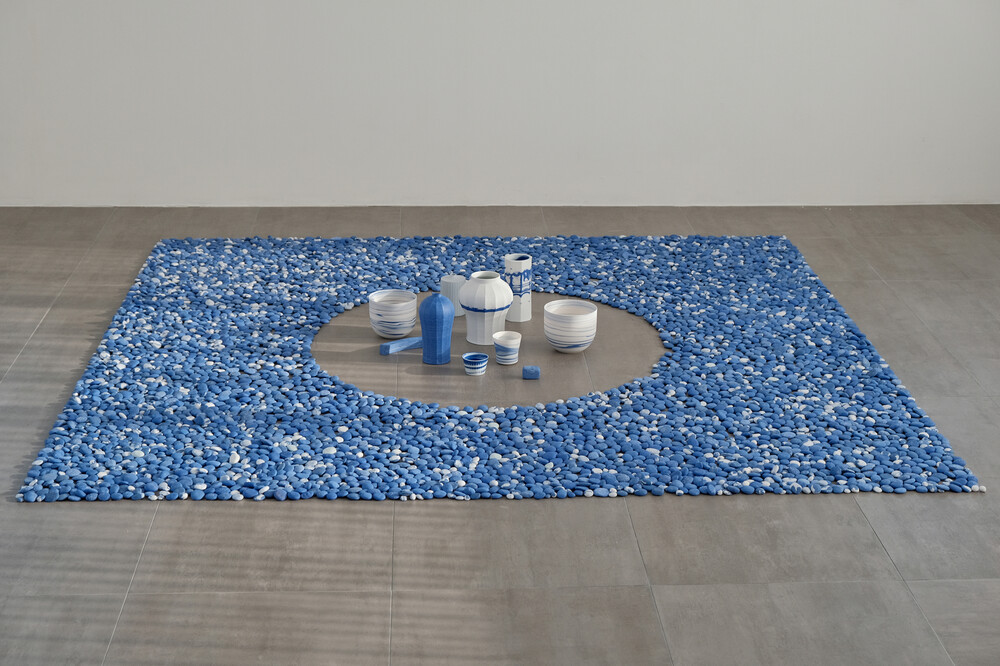 이번 조용한 변주 A quiet variation _ Blue는 과거에 코발트 안료를 곱게 분쇄하여 초벌 된 도자기 표면에 문양을 그려내었던 채색의 방식을 벗어나 폐백토에 코발트 안료를 섞어 청색토를 만들고 두 손으로 빚어 수많은 돌을 만든 뒤 설치한작품이다. 돌, 광석은 자연에서 고온과 높은 압력에 의해 형성되고 두 손으로 빚어 고화도에서 번조한 이 푸른 돌들 또한 자연의 과정과 유사하게 만들어진다.이번 설치작업은 이렇듯 푸르게 빛나는 청색이 널리 사용되며 사랑받는 것을 반기고 귀한색이였던 청색의 옛 모습을 기념하는 것이다. 자연에서 힘들게 얻은 재료를 다시 자연과 닮아있는 과정을 통해 자연의 산물인 돌로 환원함으로써 재료의 변주에 대하여 다시금 생각한다.